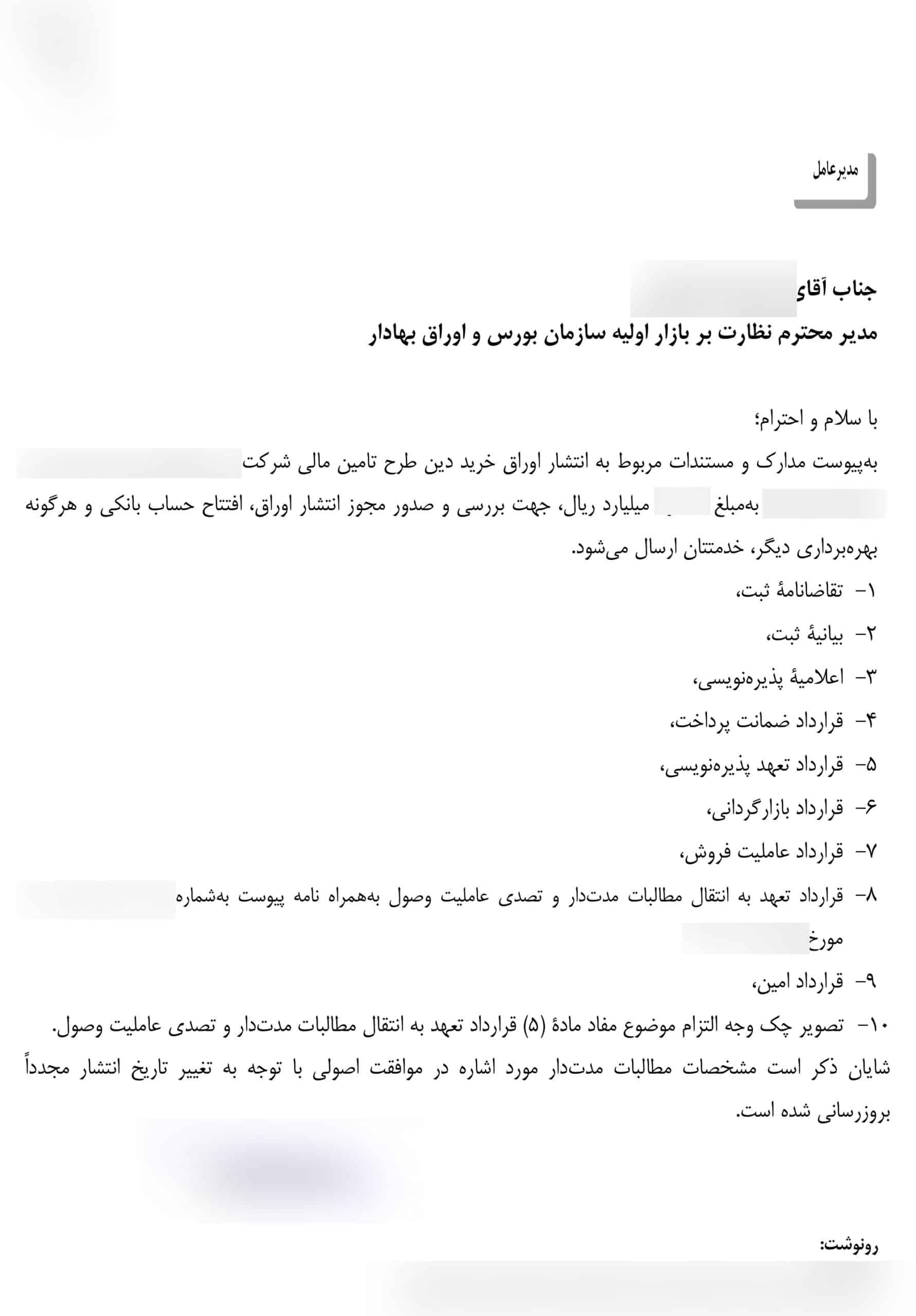 | 10 | ارسال پیش نویس فرمها و قراردادهای مربوطه توسط بانی یا مشاور عرضه | https://www.sukukplus.ir/wp-content/uploads/2023/02/4-ارسال-پیش-نویس-فرمها-و-قراردادهای-مربوطه-توسط-بانی-یا-مشاور-عرضه-4-scaled.jpg |
