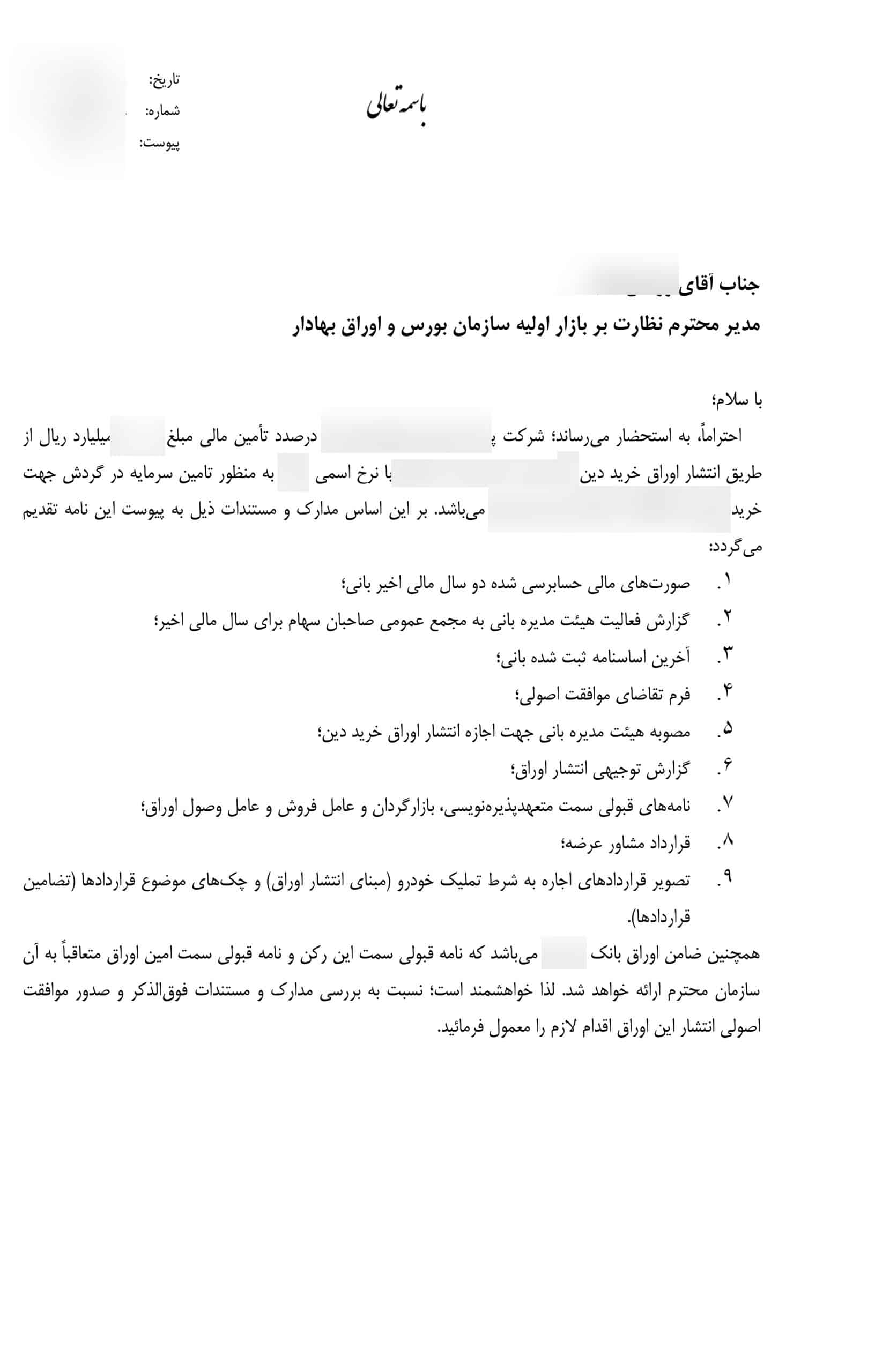 | 1 | درخواست صدور موافقت اصولی تامین مالی از طریق انتشار اوراق خرید دین توسط بانی/مشاور به سبا | https://www.sukukplus.ir/wp-content/uploads/2023/02/درخواست-موافقت-اصولی-scaled.jpg |