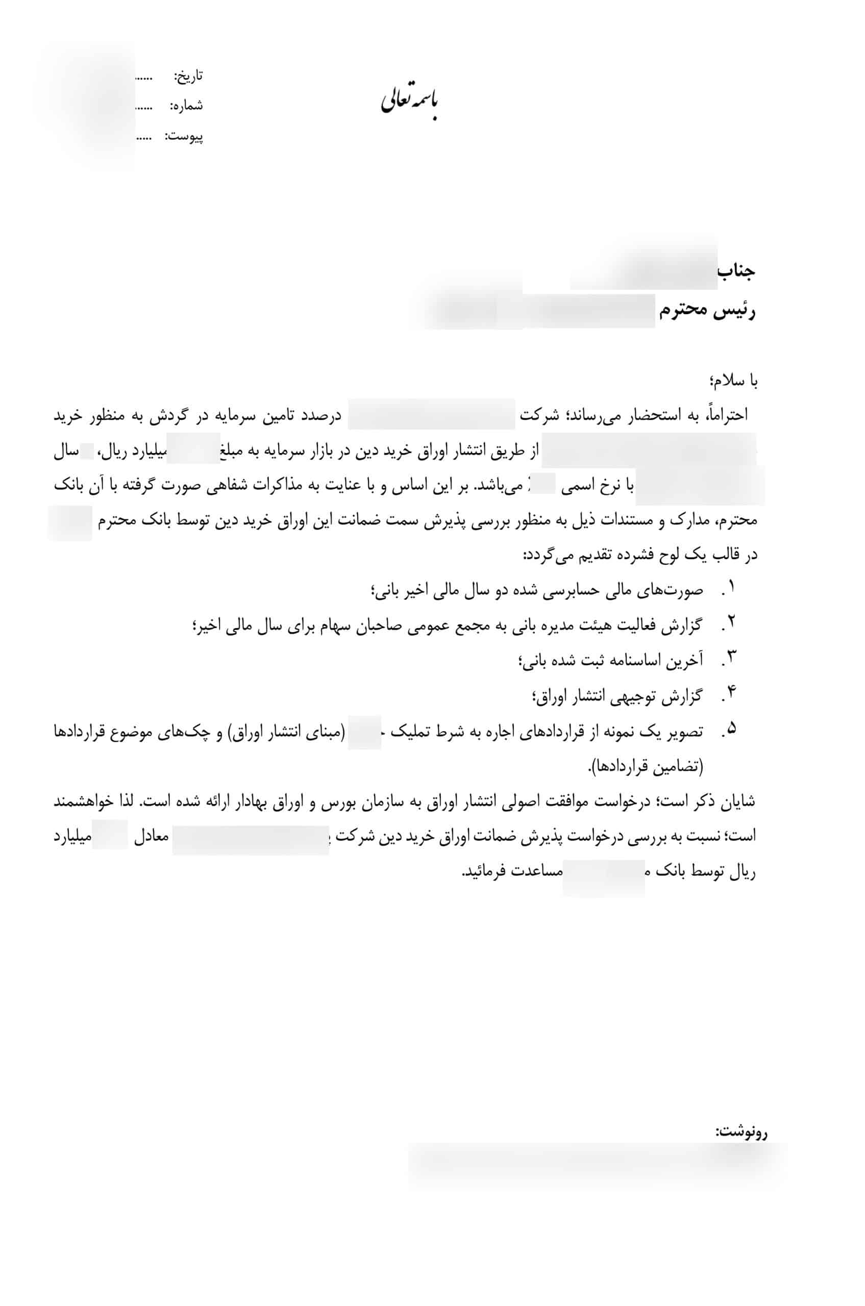 | 5 | درخواست پذیرش ضمانت اوراق توسط بانی/مشاور به ضامن ثالث | https://www.sukukplus.ir/wp-content/uploads/2023/02/درخواست-پذیرش-ضمانت-به-بانک-scaled.jpg |