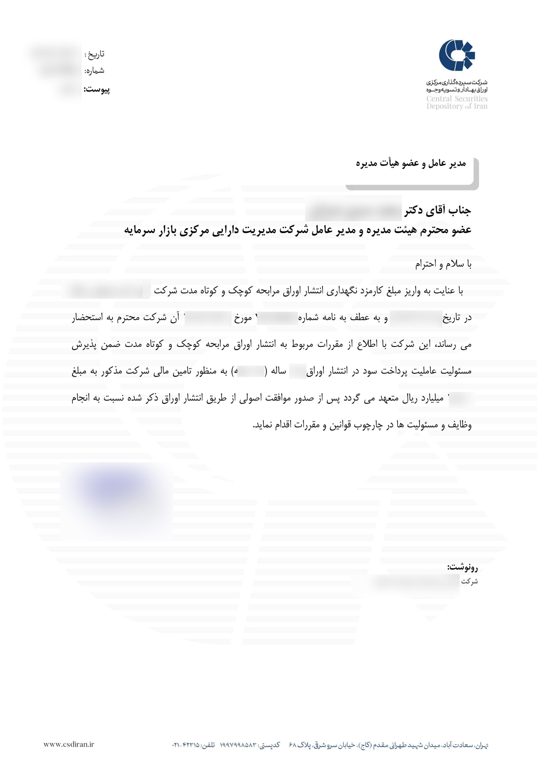 | 2.6 | تاییدیة شرکت سپردهگذاری مرکزی اوراق بهادار و تسویۀ وجوه (سهامی عام) جهت واریز وجوه پرداختی از طرف بانی در سررسید یا سررسیدهای معین به حساب دارندگان اوراق | |